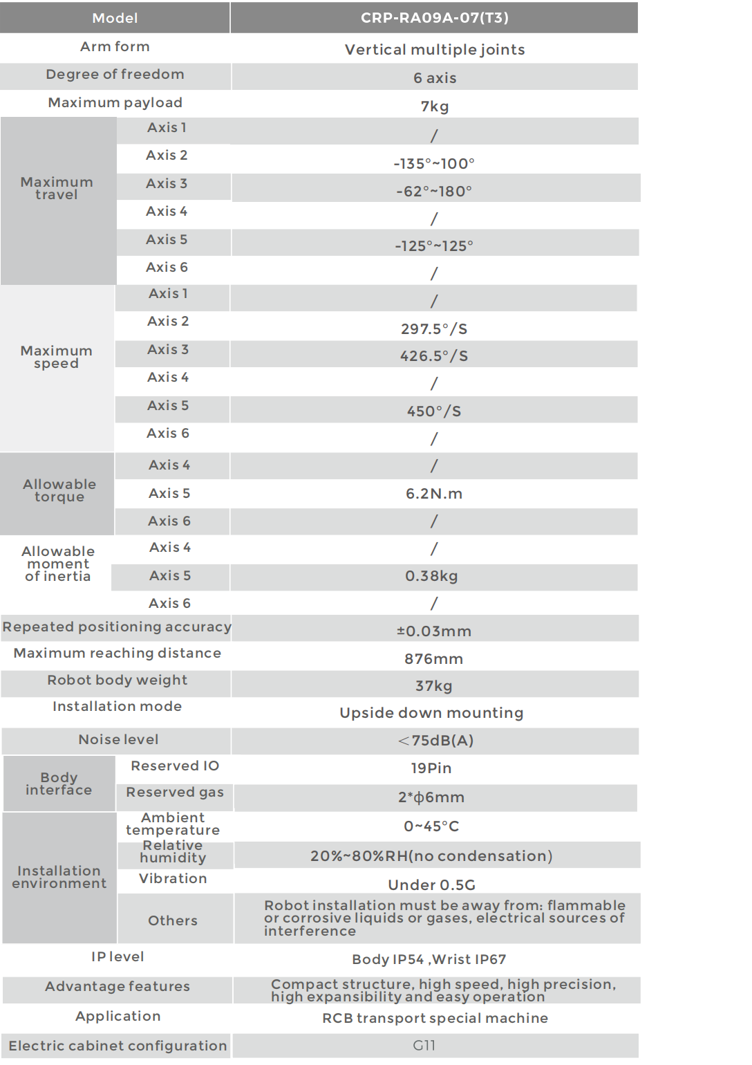 CRP-RA09A-07 (T3) is mainly customized for the production and application of PCB board industry. It is applied in the loading and unloading process of PCB board industry. In order to adapt to the PCB industry, CRP robot with light weight, simple application, high speed and lower cost is launched to meet the needs of customers for robots.