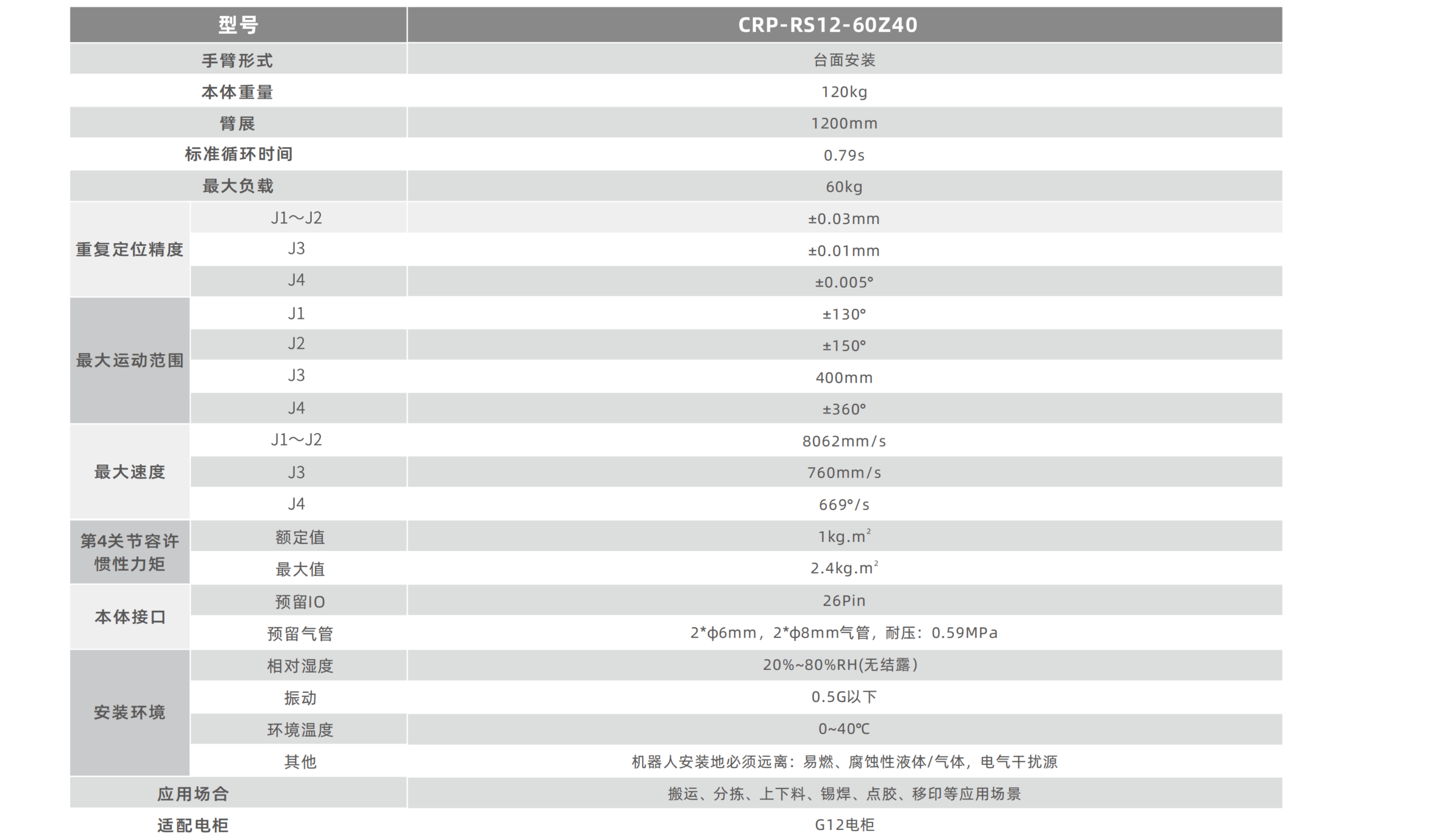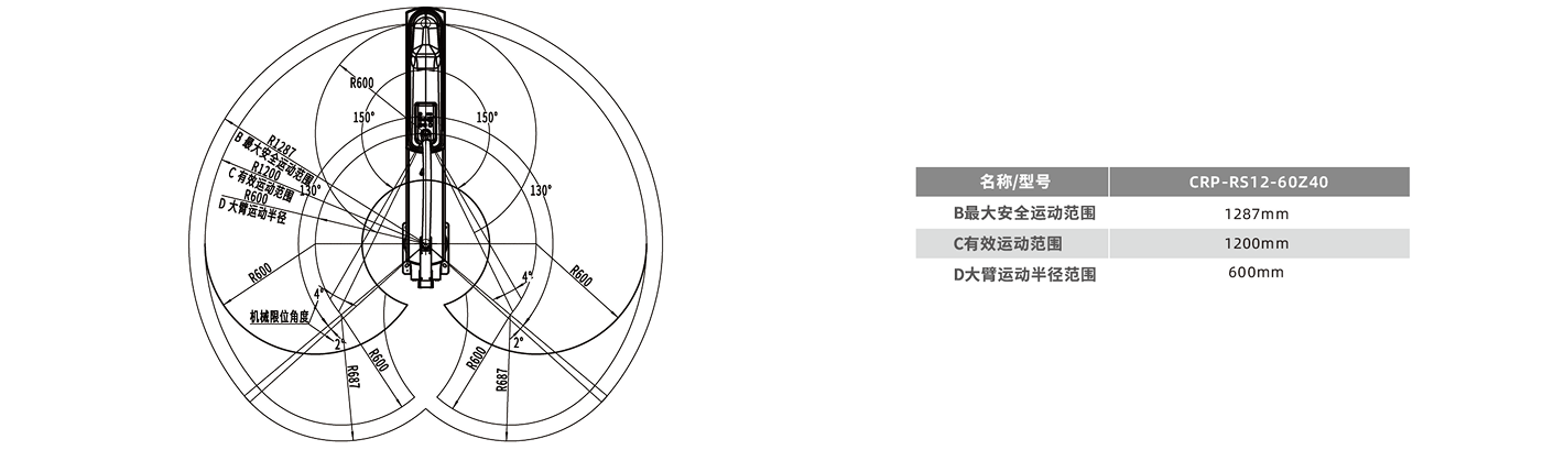 • 机器人最大负载可达60kg,臂展可达1200mm,Z轴有效行程可满足400mm。