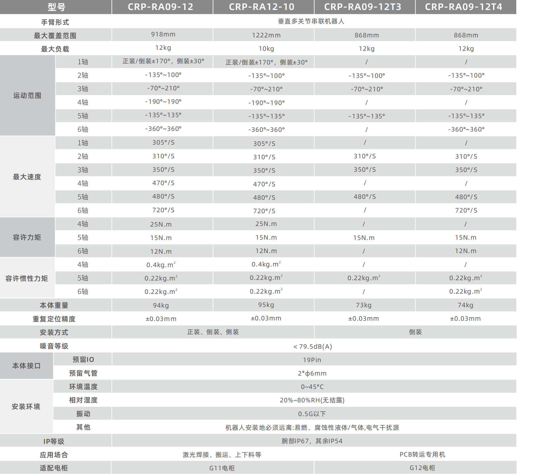本体采用高刚性设计方案,其刚性更高。内部全封闭方案,小臂防护等级达IP67,负载更大,范围更广,机器人负载12kg,臂展为900mm,机器人手腕具备更高的扭矩和惯量,负载承受能力更强,应用的场景更广。